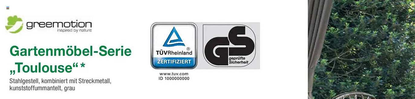 Sehen Sie sich jetzt das Gartenmöbel-Serie „Toulouse“ Angebot im toom Baumarkt Prospekt an. Dieses Angebot ist gültig von 19.02.2025 bis 30.04.2025.