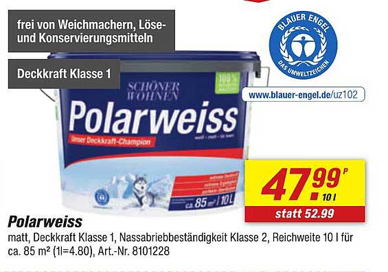 Sehen Sie sich jetzt das Polarweiss von Schönherr Wohnen - 10L für nur 47,99 € statt 52,99 € Angebot im toom Baumarkt Prospekt an. Dieses Angebot ist gültig von 12.07.2025 bis 18.07.2025.