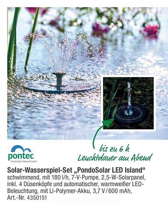 Möchten Sie sofort informiert werden, sobald das Solar-Wasserspiel-Set „Pondosolar Led Island“ im Angebot ist? Melden Sie sich für unsere Angebots-Benachrichtigungen an. So erhalten Sie eine Benachrichtigung, sobald das Produkt zu einem günstigen Preis verfügbar ist.