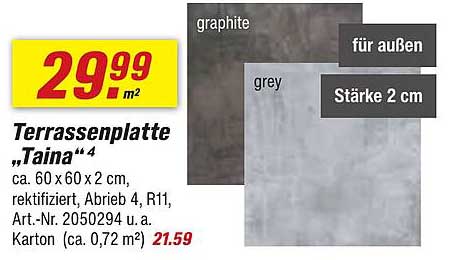 Der reguläre Preis für die Terrassenplatte „Taina“ liegt bei 29,99 € pro Quadratmeter. Mit dem aktuellen Angebotspreis von nur 21,59 € pro Karton profitieren Sie von einer attraktiven Ersparnis. Dies macht die Platten zu einer idealen Wahl für jeden, der sowohl auf Qualität als auch auf Preis-Leistungs-Verhältnis Wert legt.