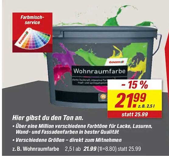 Die toom Wohnraumfarbe ist nicht nur ein Farbton, sie ist das Herzstück deiner Wohnräume! Perfekt geeignet für kreative Projekte, macht sie es dir einfach, deinem Zuhause einen frischen, neuen Look zu verleihen. Mit diesem Angebot hast du die Chance, deine Wände in über einer Million Farbvariationen zu verwandeln und das zu einem außergewöhnlichen Preis!