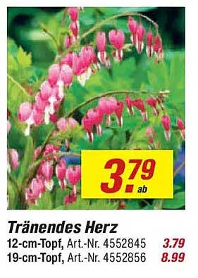 Sehen Sie sich das Tränendes Herz Angebot bei toom Baumarkt an! Dieses fantastische Angebot ist jetzt im neuesten toom Baumarkt Prospekt verfügbar. Nutzen Sie diese Chance und sparen Sie viel bei Ihrem Einkauf.