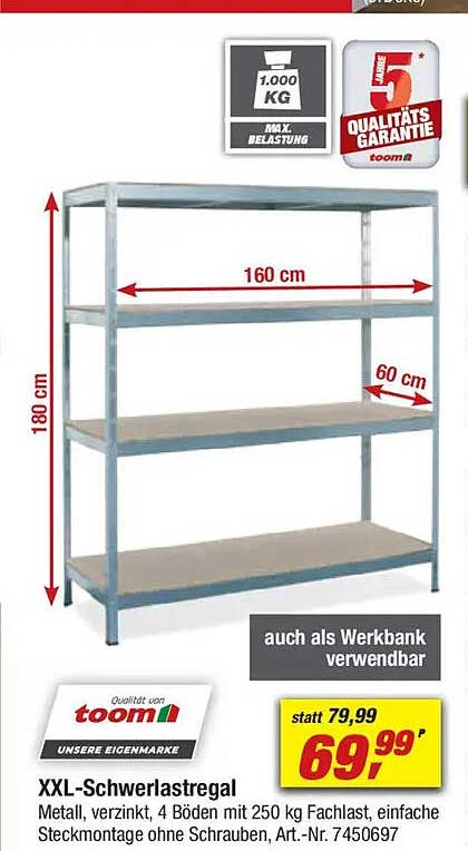 Sehen Sie sich das Xxl-Schwerlastregal Angebot bei toom Baumarkt an! Dieses fantastische Angebot ist jetzt im neuesten toom Baumarkt Prospekt verfügbar. Nutzen Sie diese Chance und sparen Sie viel bei Ihrem Einkauf.