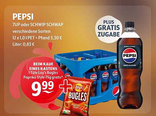 Möchten Sie sofort informiert werden, sobald das Pepsi im Angebot ist? Melden Sie sich für unsere Angebots-Benachrichtigungen an. So erhalten Sie eine Benachrichtigung, sobald das Produkt zu einem günstigen Preis verfügbar ist.