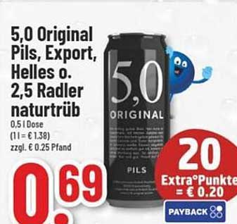 Sehen Sie sich jetzt das 5,0 Original Pils, Export, Helles oder 2,5 Radler naturtrüb Angebot im trinkgut Prospekt an. Dieses Angebot ist gültig von 23.06.2025 bis 28.06.2025.