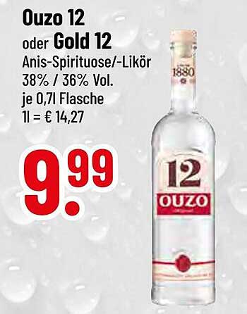 Sehen Sie sich jetzt das Ouzo 12 oder Gold 12 Anis-Spirituose - 0,71 l zum Aktionspreis Angebot im trinkgut Prospekt an. Dieses Angebot ist gültig von 14.07.2025 bis 19.07.2025.