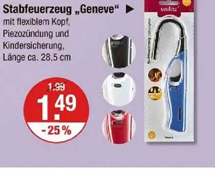 Sehen Sie sich jetzt das Stabfeuerzeug "Geneve" mit flexiblem Kopf, Piezozündung und kindersicherung, Länge ca. 28,5 cm Angebot im V-Markt Prospekt an. Dieses Angebot ist gültig von 27.03.2025 bis 02.04.2025.