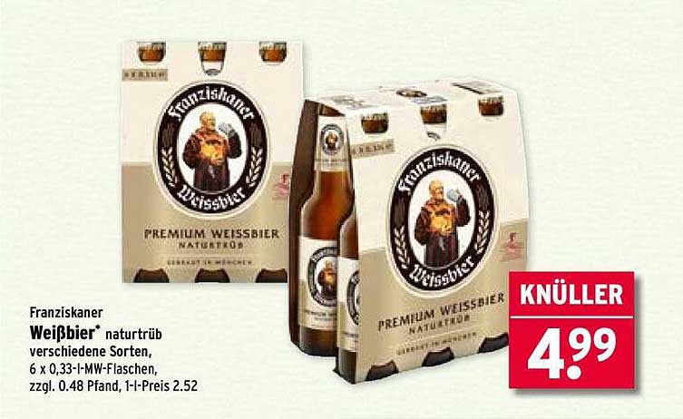 Ein echter Klassiker unter den Bieren: Das Franziskaner Weißbier naturtrüb. Diese Spezialität aus Bayern begeistert nicht nur eingefleischte Bierliebhaber, sondern auch Gelegenheitsgenießer. Jetzt ist die Gelegenheit günstig, um sich ein paar Flaschen dieses geschmackvollen Bieres zu sichern. Der erstklassige Preis von nur 4,99 € für ein 6er-Pack macht dieses Angebot unwiderstehlich und sollte auf der Einkaufsliste nicht fehlen.