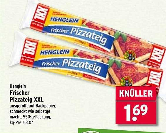 Der Henglein Frische Pizzateig wird aus besten Zutaten gefertigt und ist auf Backpapier ausgerollt, was das Backen erheblich erleichtert. Mit einem kg-Preis von 3,07 € ist er nicht nur eine praktische, sondern auch eine kostengünstige Wahl für Pizza-Liebhaber.