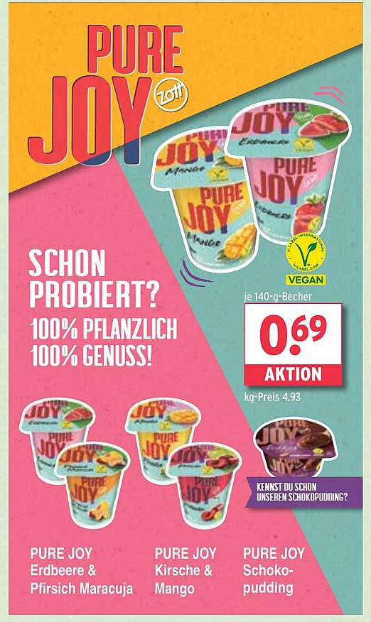Sehen Sie sich jetzt das PURE JOY pflanzlicher Joghurt von Zott – Erbeer & Pfirsich / Kirsche & Mango Angebot im Wasgau Prospekt an. Dieses Angebot ist gültig von 19.05.2025 bis 24.05.2025.