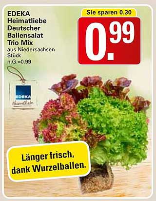 Genießen Sie den frischen Geschmack des EDEKA Heimatliebe Deutschen Ballensalat Trio Mix! Dieses einzigartige Angebot vereint die besten Salatsorten aus Niedersachsen und begeistert mit einer außergewöhnlichen Frische, die Ihre Gerichte aufwertet. Mit einem Preis von nur 0,99 Euro ist dieser Salat nicht nur köstlich, sondern auch äußerst preiswert und ideal für Ihre nächste Mahlzeit oder Grillparty.