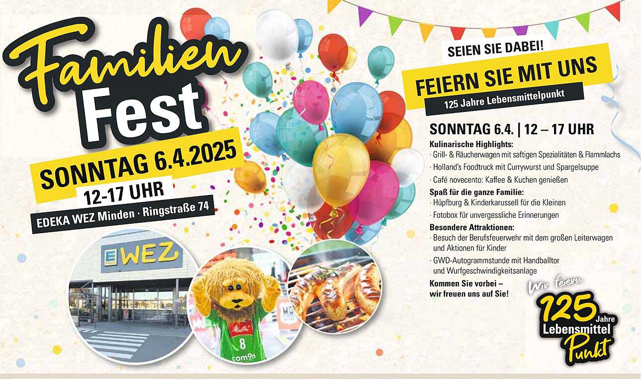 Das Familien Fest im EDEKA WEZ Minden ist der ideale Anlass, um einen wunderbaren Sonntag mit der gesamten Familie zu verbringen. Am 6. April 2025 von 12 bis 17 Uhr erwartet die Besucher ein abwechslungsreiches Programm mit kulinarischen Köstlichkeiten, Spielen für die Kinder und vielen weiteren Aktivitäten. Lassen Sie sich von der festlichen Stimmung mitreißen und genießen Sie einen besonderen Tag!