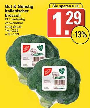 Ursprünglich für 1,49 € angeboten, können Sie jetzt beim Kauf von Gut & Günstig Italienischem Broccoli ganze 20 Cent sparen. Mit einem Preis von nur 1,29 € für 500g erhalten Sie frisches Gemüse zu einem hervorragenden Preis-Leistungs-Verhältnis. Nutzen Sie die Chance und profitieren Sie von diesem attraktiven Preis!