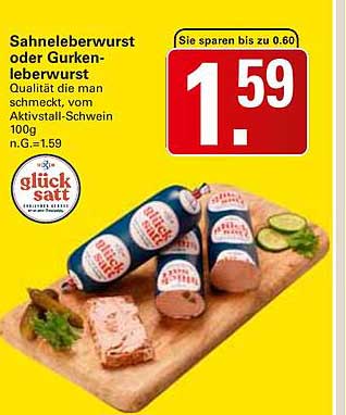 Sehen Sie sich jetzt das Sahneleberwurst oder Gurkenleberwurst 100g von Glück satt Angebot im WEZ Prospekt an. Dieses Angebot ist gültig von 13.10.2025 bis 18.10.2025.