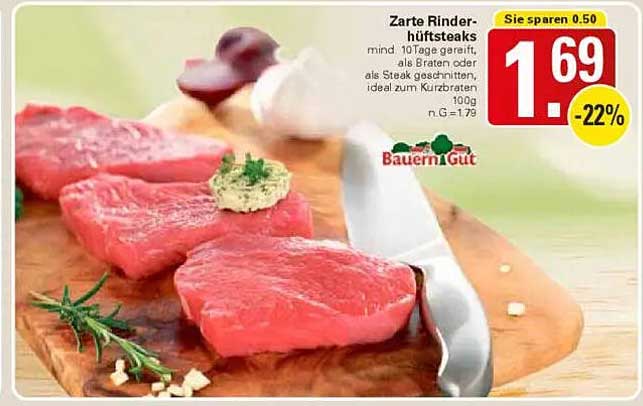 Normalerweise liegt der Preis für diese hochwertigen Rinderhüftsteaks bei 1,79 € pro 100 g. Dank des aktuellen Angebots profitieren Sie von einem attraktiven Rabatt und zahlen nur 1,69 €. Das bedeutet eine Ersparnis von über 22 %, sodass Sie jetzt zu einem besonders guten Preis zugreifen können.