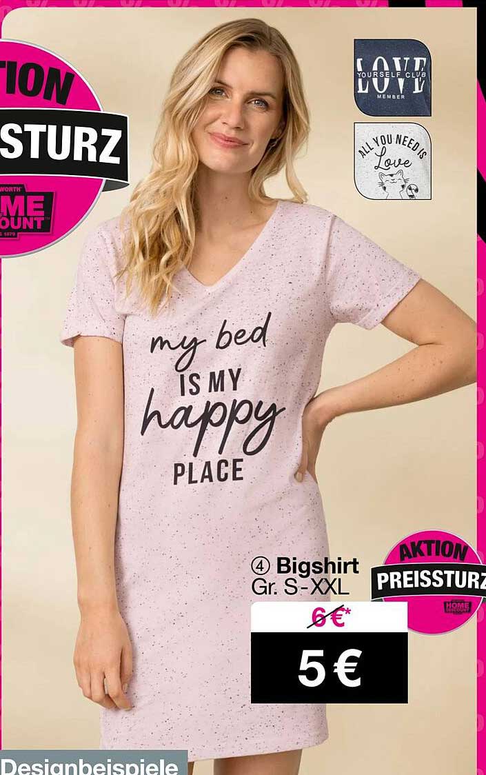 Sehen Sie sich jetzt das Bigshirt "my bed is my happy place" in verschiedenen Größen Angebot im Woolworth Prospekt an. Dieses Angebot ist gültig von 27.06.2025 bis 08.07.2025.