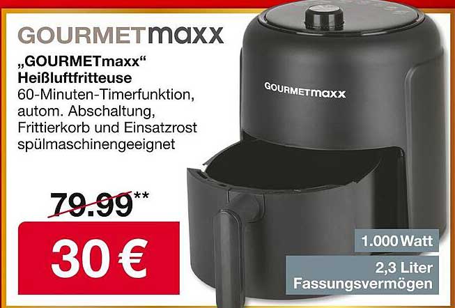 Der Originalpreis der "GOURMETmaxx" Heißluftfritteuse beträgt 79,99 Euro, doch auf dieser Seite können Sie sie zum unglaublichen Preis von nur 30 Euro erwerben. Das bedeutet für Sie eine Ersparnis von satten 49,99 Euro. Ein solches Angebot sollten Sie sich nicht entgehen lassen, denn so können Sie gesund kochen und gleichzeitig Geld sparen.