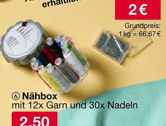 In der Nähbox finden Sie alles, was das Herz eines Nähbegeisterten höher schlagen lässt. Mit 12 verschiedenen Garnen und 30 Nadeln sind Sie bestens ausgestattet für Ihre kreativen Projekte. Dieses Angebot ist ideal für Anfänger und Fortgeschrittene, die ihrer Kreativität freien Lauf lassen möchten. Für nur 2,50 € erhalten Sie die perfekte Grundausstattung für Ihre Näharbeiten.