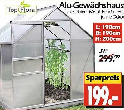 Das Alu-Gewächshaus von Top Flora ist das perfekte Zuhause für Ihre Pflanzen. Ob Gemüse, Kräuter oder Blumen – mit diesem hochwertigen Gewächshaus schaffen Sie optimale Wachstumsbedingungen. Dieses Angebot ist besonders attraktiv, denn es bietet Ihnen die Möglichkeit, Ihre grüne Oase zu einem reduzierten Preis zu erwerben. Gültig vom 20. Oktober bis zum 25. Oktober 2025, können Sie von einer sensationellen Ersparnis profitieren.