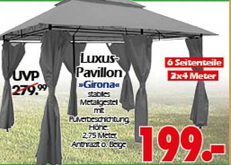 Mit einem aktuellen Preis von nur 199,- Euro im Vergleich zur unverbindlichen Preisempfehlung von 279,99 Euro können Sie eine Ersparnis von 80,99 Euro realisieren. Dies macht den Pavillon zu einem hervorragenden Angebot für alle, die die Freiluftsaison in vollen Zügen genießen möchten.