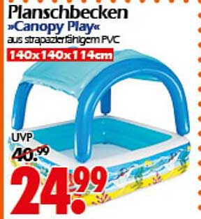 Sehen Sie sich jetzt das Planschbecken »Canopy Play« aus strapazierfähigem PVC Angebot im Wreesmann Prospekt an. Dieses Angebot ist gültig von 14.07.2025 bis 20.07.2025.