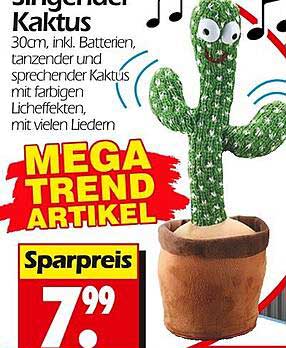 Mit einem Kaufpreis von nur 5,49 Euro ist dieser sprechende Kaktus deutlich günstiger als der reguläre Preis von 7,99 Euro. Das bedeutet eine Ersparnis von 2,50 Euro! Dieser Preis ist nicht nur fair, sondern gibt Ihnen die Möglichkeit, ein hochwertiges und unterhaltsames Produkt zu einem Schnäppchenpreis zu erwerben – ein absolutes Muss für jeden, der Freude in sein Leben bringen möchte.