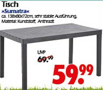 Der Tisch »Sumatra« ist ein absolutes Must-Have für jeden Gartenfreund und die perfekte Ergänzung für Ihre Terrasse oder den Balkon. Mit seinen kompakten Maßen von ca. 138x80x72 cm bietet er ausreichend Platz für gemütliche Frühstücke, Grillabende mit Freunden oder entspannte Nachmittage mit einem guten Buch. In der stabilen Ausführung aus hochwertigem Kunststoff vereint er Funktionalität mit einem modernen Design.