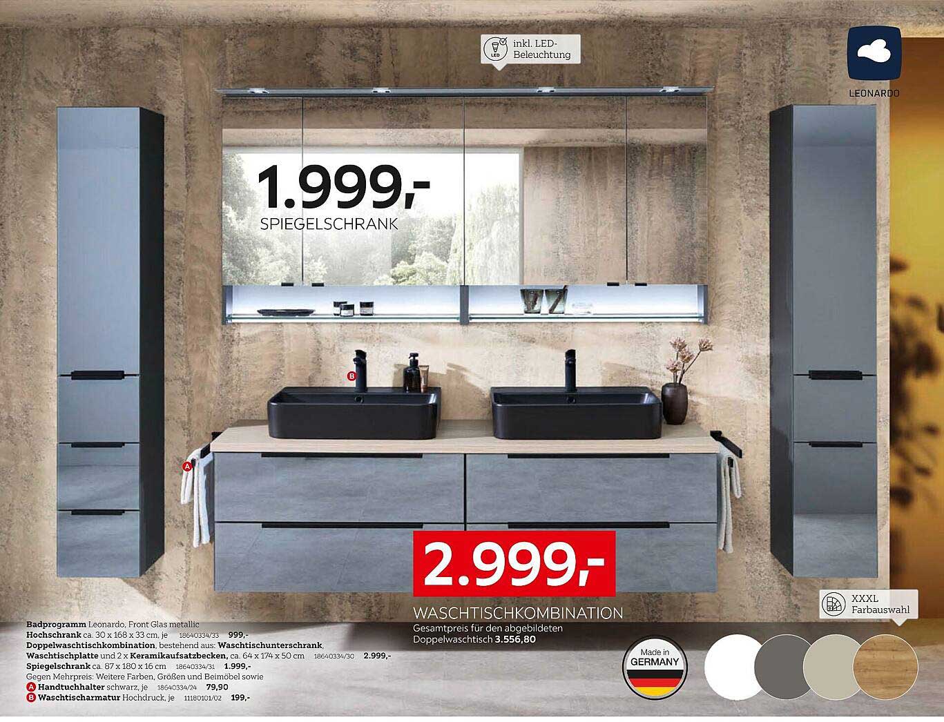 Im aktuellen Angebot erhalten Sie die gesamte Waschtischkombination zum Preis von 2.999,- Euro - ein echter Schnäppchenpreis! Im Vergleich dazu lag der Normalpreis bei 3.556,80 Euro. Das bedeutet, dass Sie hier eine Ersparnis von über 557 Euro erzielen können. Ein unwiderstehliches Angebot für alle, die Wert auf Qualität und Design legen!