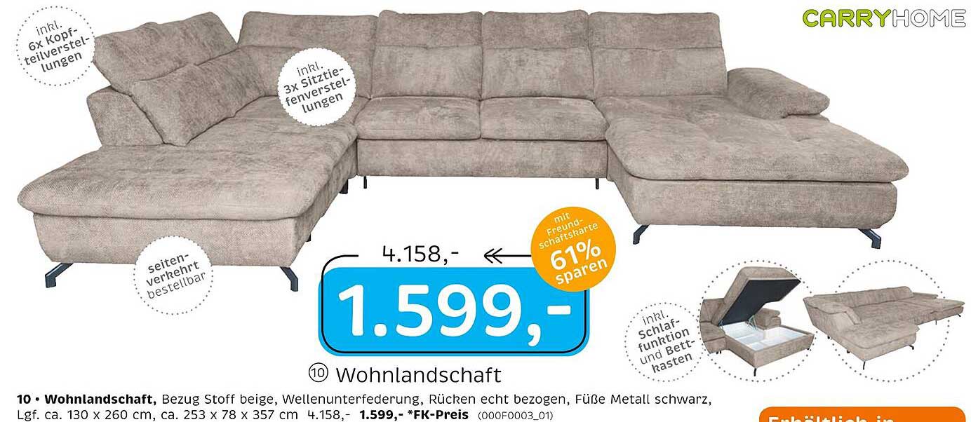 Der Normalpreis dieser stilvollen Wohnlandschaft liegt bei 4.158,- €. Dank dieses exklusiven Angebots profitieren Sie von einem sensationellen Rabatt von 61% und zahlen nur 1.599,- €. Dies macht es zu einer hervorragenden Gelegenheit, hochwertige Möbel zu einem unschlagbaren Preis zu erwerben.