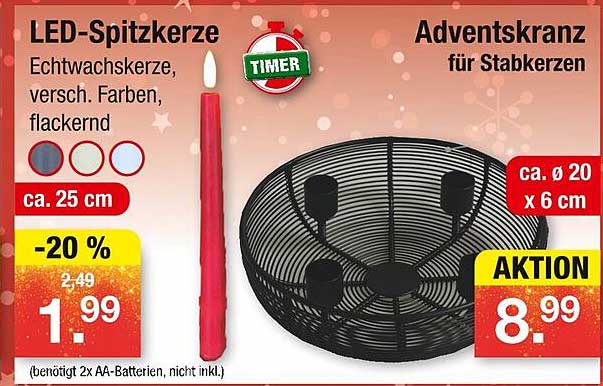 Der reguläre Preis für diese Kombination liegt bei 10,98 Euro, aber im Aktionszeitraum zahlen Sie nur 8,99 Euro für den Adventskranz und 1,99 Euro für die LED-Spitzkerze. Das bedeutet eine Ersparnis von über 20%! Nutzen Sie diese Gelegenheit, um Ihr Zuhause in der Adventszeit festlich zu schmücken, und profitieren Sie von unserem einmaligen Angebot.