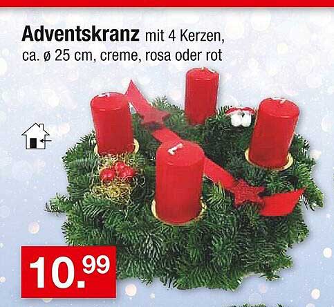 Sehen Sie sich jetzt das Adventskranz mit 4 Kerzen, ca. Ø 25 cm, creme, rosa oder rot Angebot im Zimmermann Prospekt an. Dieses Angebot ist gültig von 17.11.2025 bis 22.11.2025.