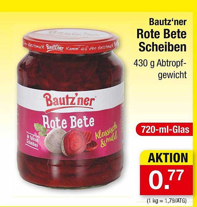 Normalerweise liegt der Preis für die Bautz'ner Rote Bete Scheiben bei 1,79 € pro Kilogramm. Dieses Angebot von nur 0,77 € ist also eine tolle Ersparnis und eine Gelegenheit, die Sie nicht verpassen sollten!