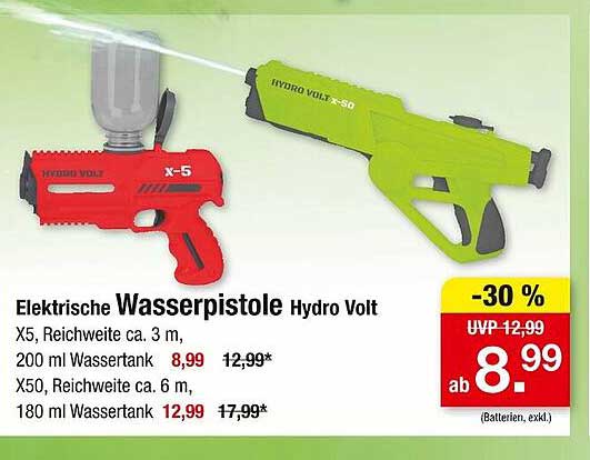 Das Angebot für die Wasserpistole Hydro Volt ist nicht nur verführerisch, sondern auch äußerst vorteilhaft. Der UVP liegt bei 12,99 €, doch während des Aktionszeitraums kannst du den X5 bereits für 8,99 € und den X50 für 12,99 € erwerben. Ein Preisnachlass von 30 % sorgt dafür, dass du großartige Ersparnisse erzielst und trotzdem nicht auf Qualität verzichten musst!