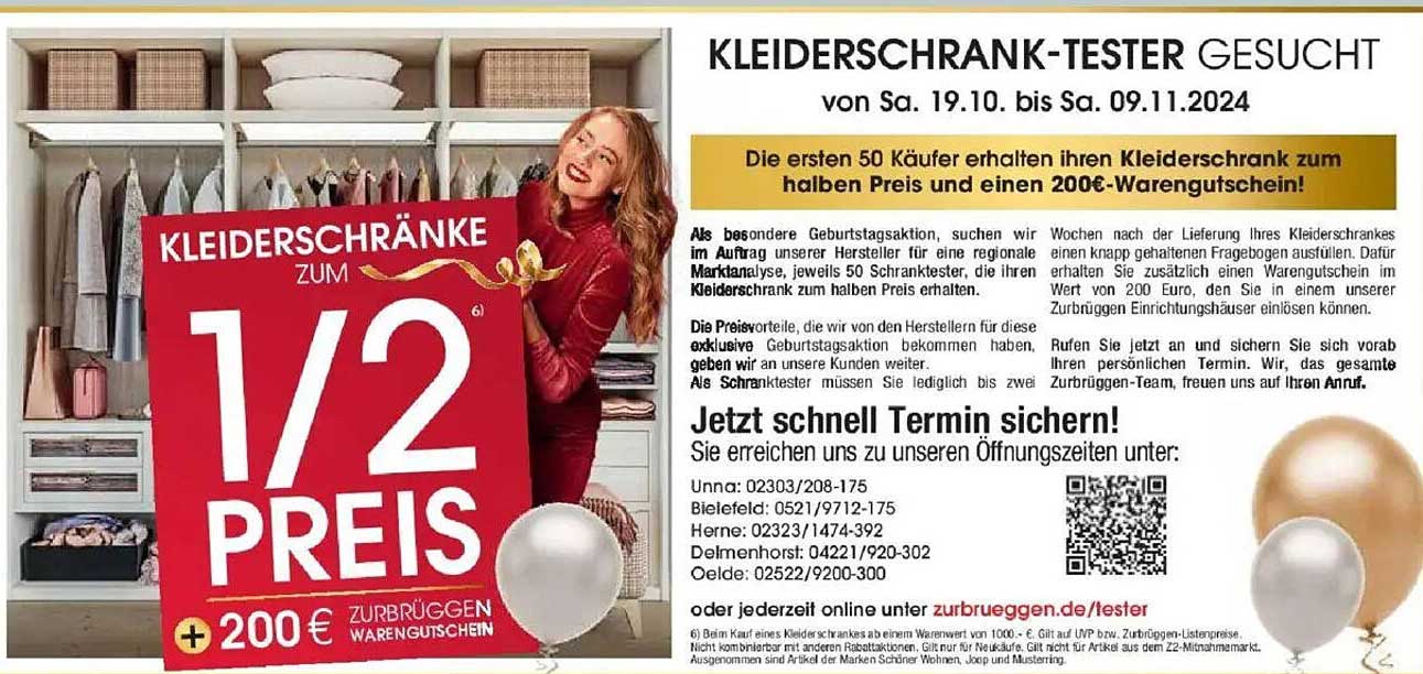 Sehen Sie sich jetzt das KLEIDERSCHRÄNKE ZUM 1/2 PREIS + 200€ WARENGUTSCHEIN Angebot im Zurbrüggen Prospekt an. Dieses Angebot ist gültig von 17.10.2025 bis 01.11.2025.