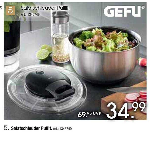 Die Salatschleuder Pullit von GEFU ist ein unverzichtbares Küchengerät für alle Salatliebhaber. Mit dieser innovativen Salatschleuder wird das Waschen und Trocknen von frischen Salaten zum Kinderspiel. Egal, ob du knackige Blattsalate, frische Kräuter oder andere Gemüsearten zubereiten möchtest, dieses Produkt ist ein Muss für eine gesunde Ernährung.